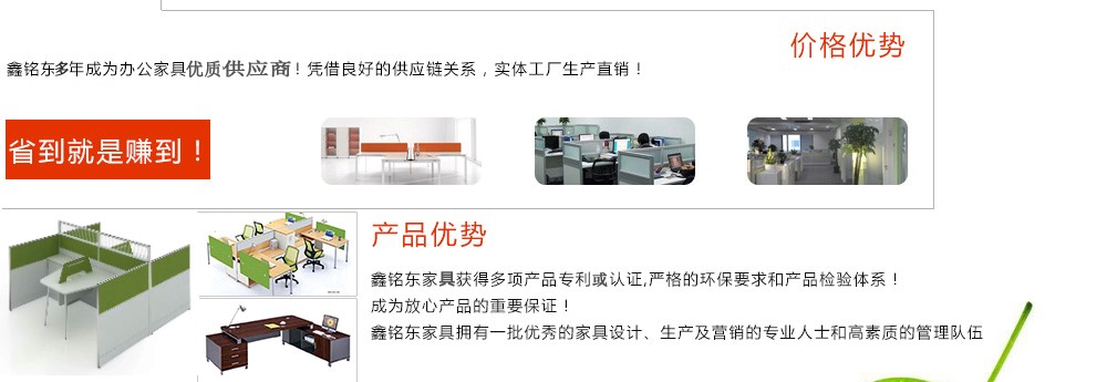 深圳市鑫銘東家具有限公司專業(yè)銷售各類辦公家具!產(chǎn)品涉及多種系列,如:班臺(tái)、班椅、屏風(fēng)、會(huì)議桌、會(huì)議椅、辦公沙發(fā)、茶幾、辦公桌、文件柜、電腦桌椅、各式餐臺(tái)、餐椅、書柜等辦公家具。 鑫銘東家具擁有一批優(yōu)秀的家具設(shè)計(jì)、生產(chǎn)及營銷的專業(yè)人士和高素質(zhì)的管理隊(duì)伍。銘東家具以"先難后易"之戰(zhàn)略,在產(chǎn)品結(jié)構(gòu)、產(chǎn)品質(zhì)量及服務(wù)水平方面,均推陳出新,力求完善,精益求精。使我們的產(chǎn)品質(zhì)量保持在國內(nèi)外家具潮流的先進(jìn)水平,力求滿足客戶的特殊需求。鑫銘東家具多年來致力于環(huán)保、實(shí)用家具的設(shè)計(jì)與開發(fā),集生產(chǎn)、銷售、服務(wù)于一體。本著"以人為本"的設(shè)計(jì)理念,大量開發(fā)符合人體工程學(xué)的各種產(chǎn)品,以"誠信為本"的質(zhì)量方針,真材實(shí)料,認(rèn)認(rèn)真真做產(chǎn)品,實(shí)實(shí)在在做人。鑫銘東家具更致力于創(chuàng)造"零維修率"的制造境界,實(shí)現(xiàn)"沒有維修的服務(wù)才是最好服務(wù)"的口號(hào)》了解更多